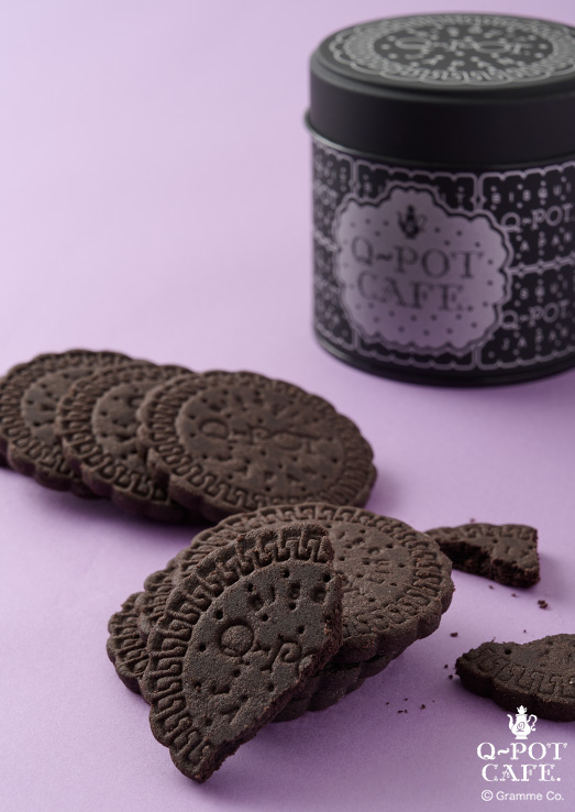 Q-pot.のロゴ入りビスケットが描かれた缶パッケージは、