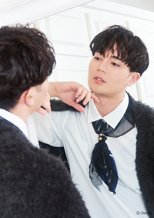 Q、『リトル・マーメイド』のアクセサリーを着用していただいたカットですね。この作品には‟アースラ“と2匹のウツボの“フロットサム”と“ジェットサム”が登場するので、鏡を利用して撮影に挑みましたが、結果、とても素敵なカットになりましたね。