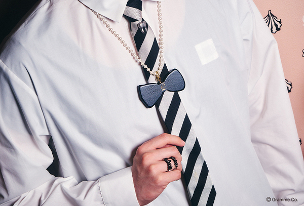 Q、今回はアレンジをたくさんしていただきました。ネクタイにつけたTOOTH(歯)は実はピアスだったり。駒田さんはピアスが開いていないということだったので、開いていない方でも楽しめるコーディネート提案ができたらいいなと!