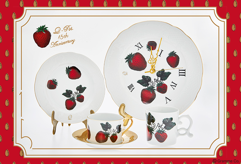よく見るとイチゴのつるが“Q-pot.”になっていたり、掛け時計の数字の9が“Q”とデザインされていて、
