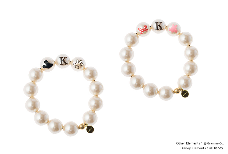 パールブレスレット/ミニーマウス (ミニーシルエットモチーフパール一粒、リボンモチーフパール一粒、お好きなイニシャル入りパール一粒、無地パール10粒 全てSサイズ(14mm)) 各5,000円+税
