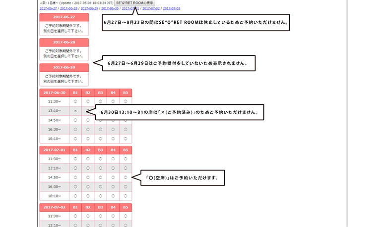 ※日付と人数を選択してから「予約状況一覧」をクリックすると、選択した日付の前後3日間の空席状況がご確認いただけます。