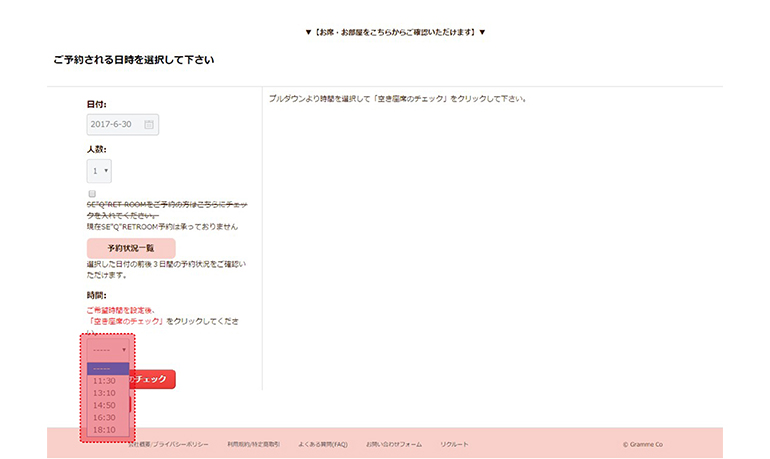 予約したい人数を選択して「時間枠のチェック」をクリックします。