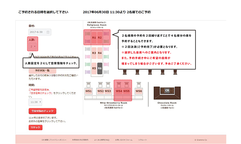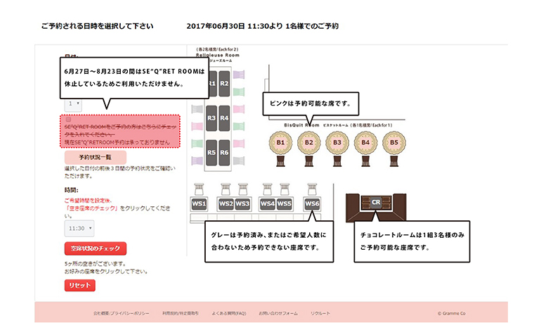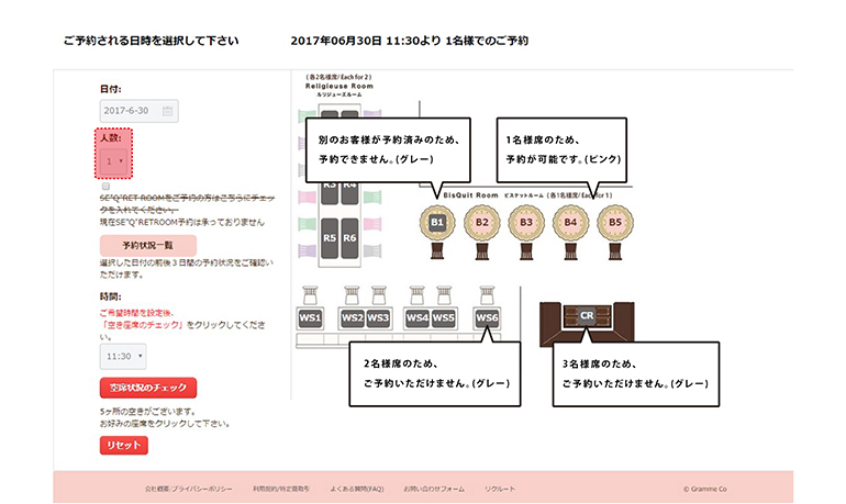 ご希望の時間・人数に対してご予約可能な座席がピンクで表示されます。ご希望の座席をクリックします。