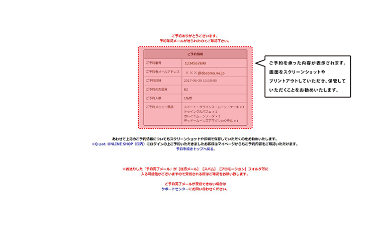 また、万が一ご予約完了メールが届かない場合でも、お客様ご自身で予約内容をご確認いただけますよう、