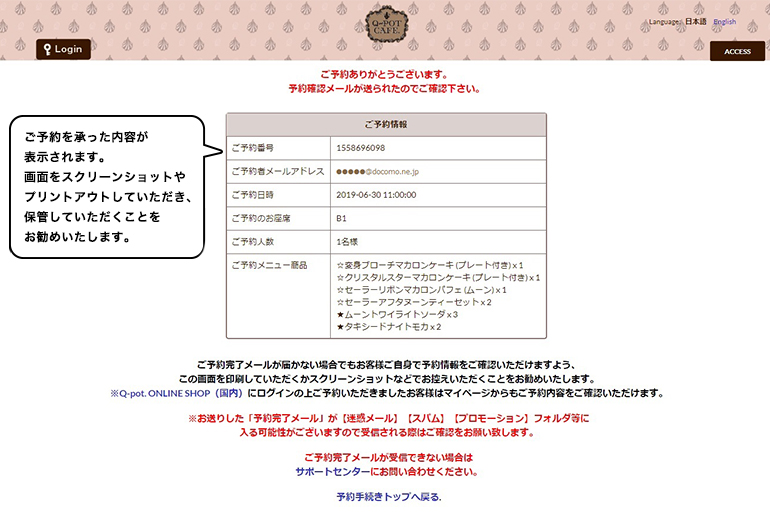 また、万が一ご予約完了メールが届かない場合でも、お客様ご自身でご予約内容をご確認いただけますよう、