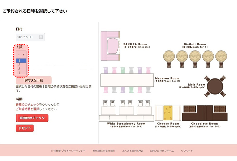 予約したい人数を選択して「時間枠のチェック」をクリックします。