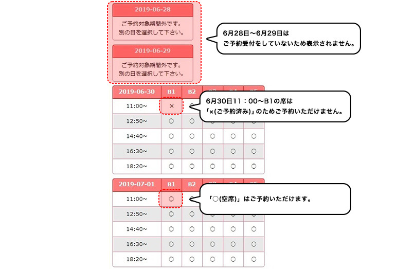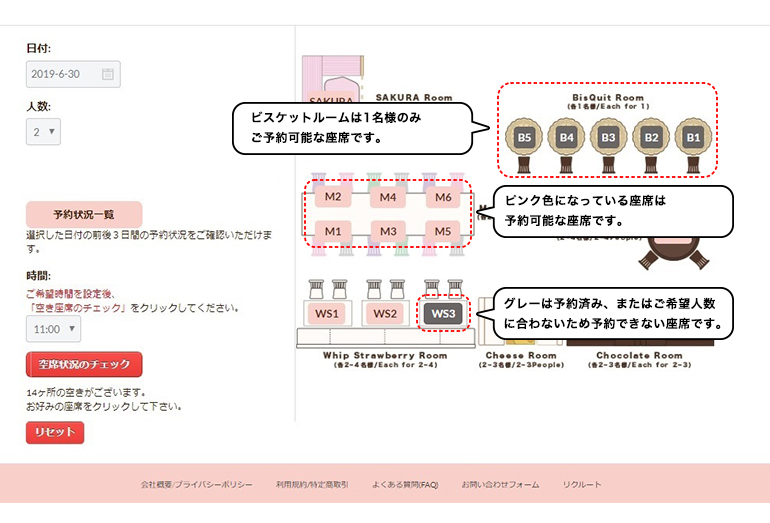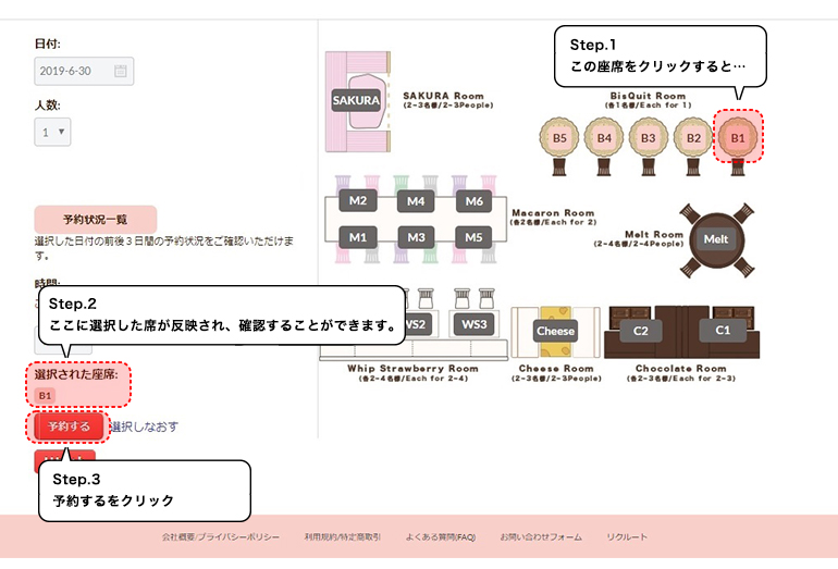 ご希望の時間・人数に対してご予約可能な座席がピンクで表示されます。ご希望の座席をクリックします。