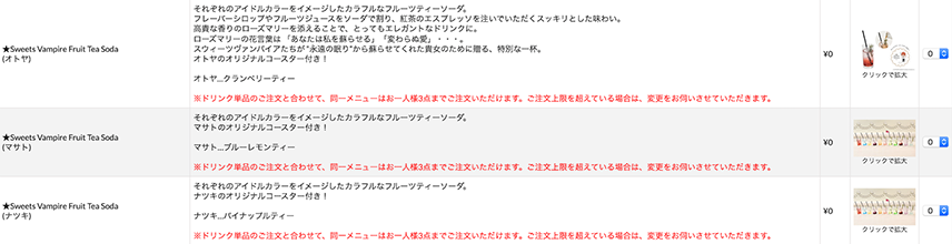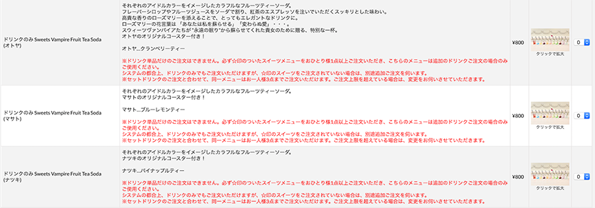 ☆印のついたメニューのご選択がなく、ドリンク単品のSweets Vampire Fruit Tea Sodaだけをご注文いただくことはご遠慮いただいております。