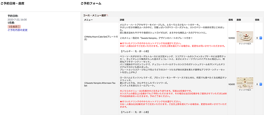 ☆印のついたメニューと、★印のドリンクが同じ数選択されている場合のみご予約が完了します。