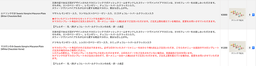例えば「Sweets Vampire Macaron Plate(White Chocolate Horse)ドリンク付きメニュー2点、
