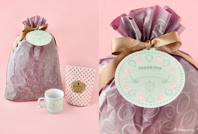 “Q”のロゴ入りのギフト巾着に入れてお届けします。