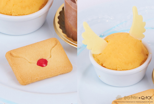 マンゴーシャーベットで再現した「金のスニッチ」を添えたら、