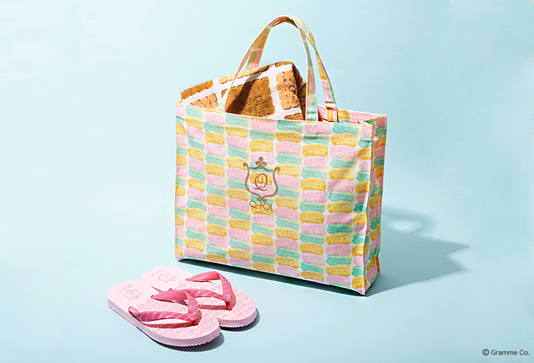 カラフルなマカロンバッグに合わせて、ビーチサンダルやタオルも甘いスイーツでコーディネートして☆