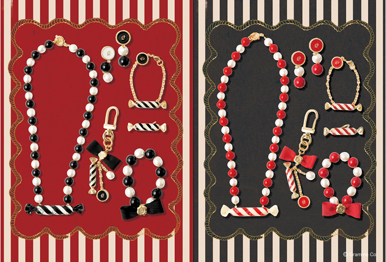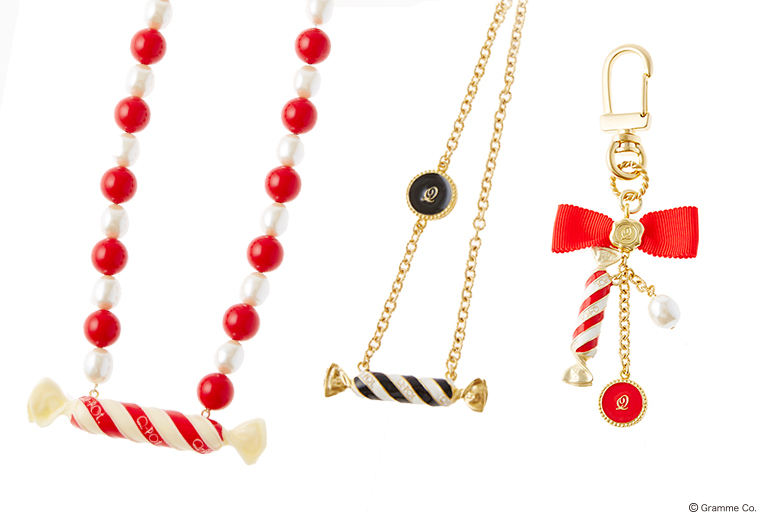 パールネックレス(レッド) 23,000円+税/ネックレス(ブラック)16,000円+税/バッグチャーム(レッド) 18,000円+税
