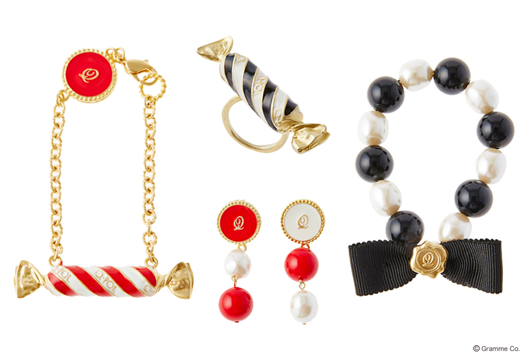 片方ずつデザインの異なるピアス&イヤリング、手元に彩りを添えてくれるブレスレットなど