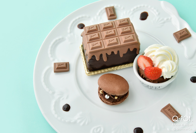 Q-pot.と刻まれたミルクチョコのタブレットと、