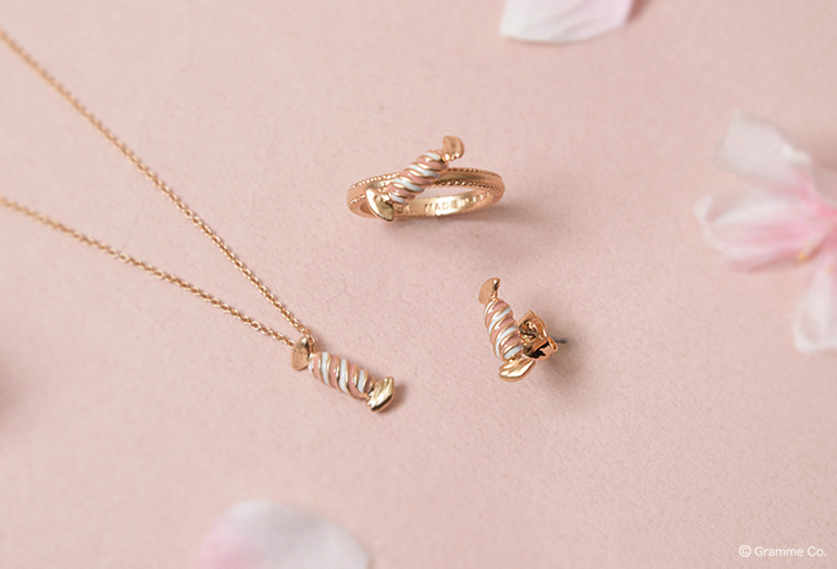 優しい桜色に染まったプチキャンディはネックレス、リング、ピアスがラインナップ。
