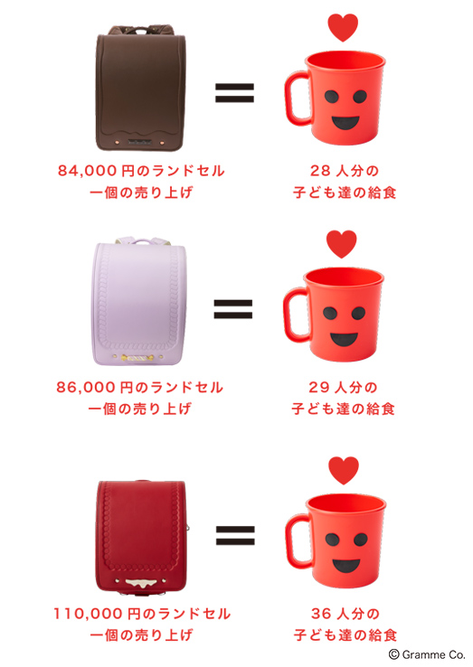 ランドセルを1個お買い上げ頂くごとに、子ども達に給食を届けることが出来ます。