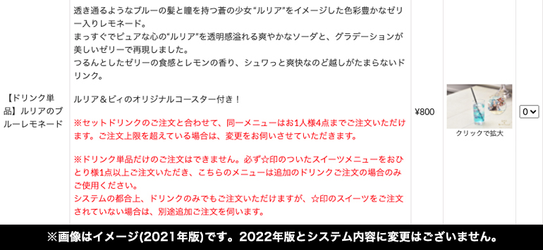 例えば「ルシファーのブラッディクランベリージュース セットドリンクメニュー2点、ルシファーのブラッディクランベリージュース単品メニュー3点」をご注文された場合は、合計5点になりますので、どれか1点を別の種類にご変更いただきます。