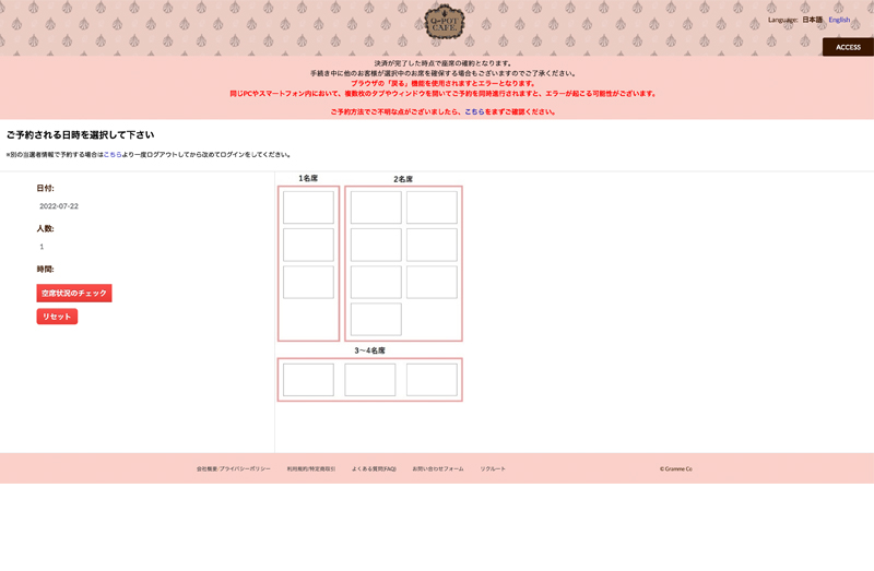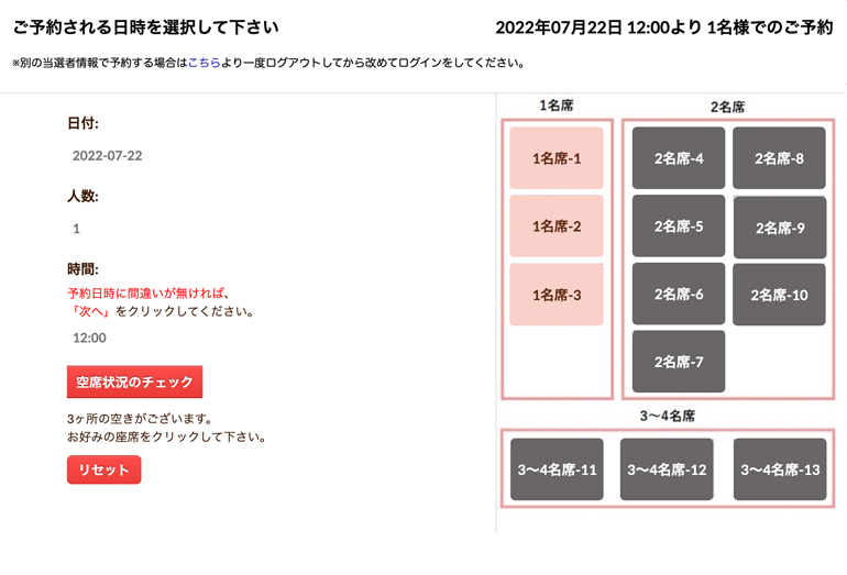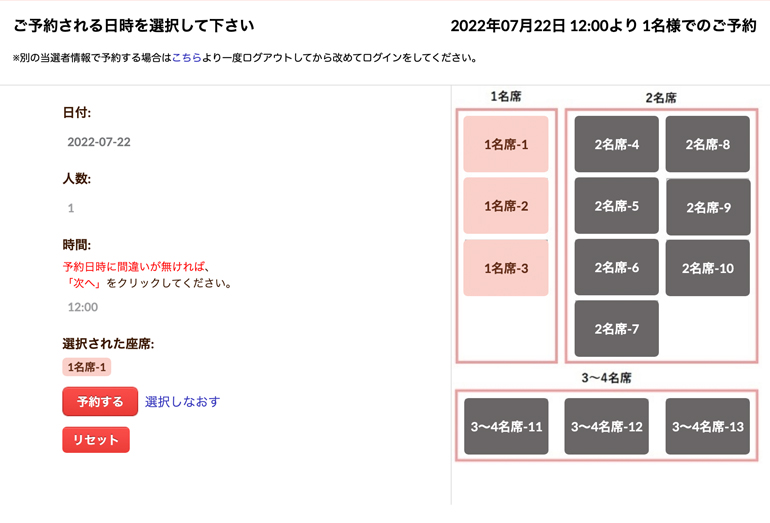 予約済み、または空席であっても予約希望人数に合わない場合はグレーの表示になります。