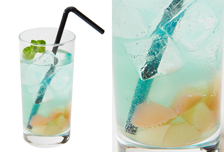 ミントブルーの海のようなドリンクは、ミントとピーチのシロップに炭酸を合わせたすっきりとした味わい。