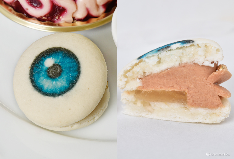目玉のマカロン=「めだマカロン」は、秋を感じるアップルシナモンフレーバー。