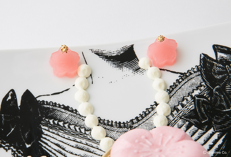 サクラ羊羹をイメージしたゼリーをピアスのように添えた淡い桜色に染まるプレートには、