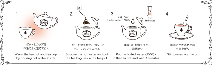 ・ホットティーの場合、300ccのポットに対しティーバッグ2袋が目安です。