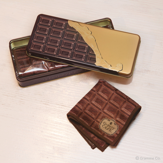 シックな板チョコ缶の中に、ロゴ入りのチョコレート柄タオル2枚入り!