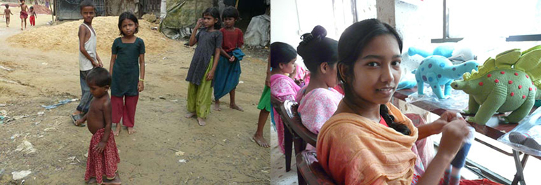難民女性とバングラデシュ人の女性は、ともに働きながらお互いに家族のように支えあっています。