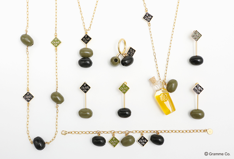 本物と見紛うほどリアルな「オリーブの実」、ゴールドに澄みきった「オリーブオイル」は