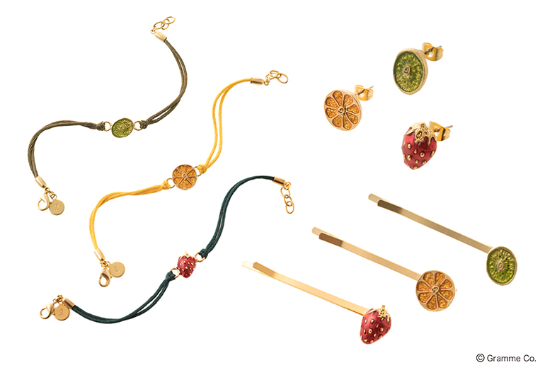 ストロベリー、キウイ、オレンジのモチーフのミサンガ、ヘアピン、ピアスが登場。