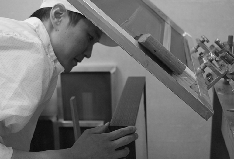 熟練の技だけが実現できる唯一無二の印刷技術で、“Q-pot. Melty Chocolate TV”の木枠にチョコレートを施しています。