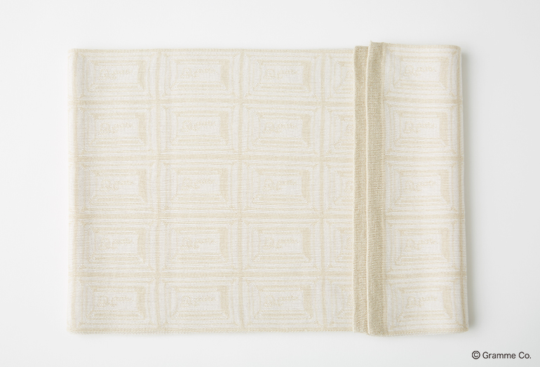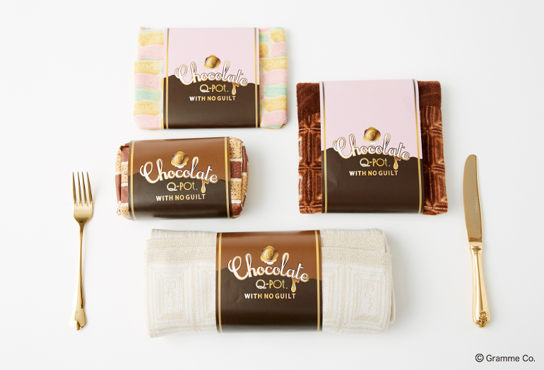 Q-pot.のシグネチャーモチーフであるチョコレート柄のマフラーは、肌触りのよい素材。