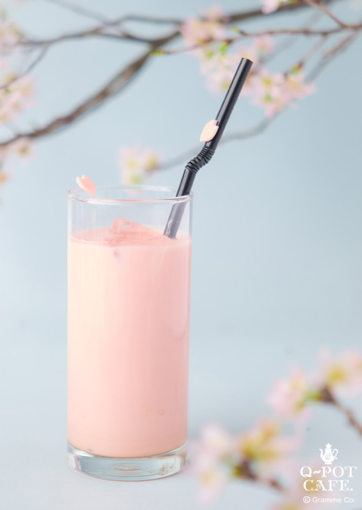 ストロベリーやお花の華やかな香りが魅力のQ-pot CAFE.オリジナル紅茶“フラワーガーデン”に、ふんわりやわらかな桃の味わいをプラスしたエンジェルティーラテ。